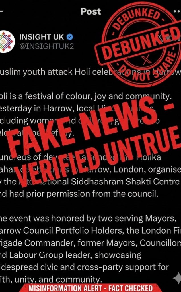 The United Kingdom Indian Muslim Council (UK-IMC) debunks the fake news circulated by Hindutva outfit INSIGHTUK that stokes up tensions between communities. It also expresses serious concern over the circulation of misleading claims following a disturbance that occurred in Harrow, London.